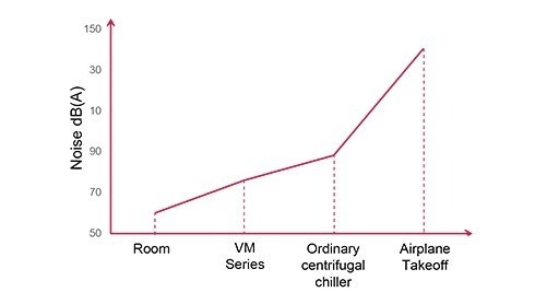Do loại bỏ ma sát cơ học, máy làm lạnh VM Hitachi vận hành êm ái với độ ồn chỉ 76 dB(A), thấp hơn 5–10 dB so với máy ly tâm truyền thống. Điều này giúp môi trường trong phòng máy dễ chịu hơn, hỗ trợ vận hành và giám sát hiệu quả.