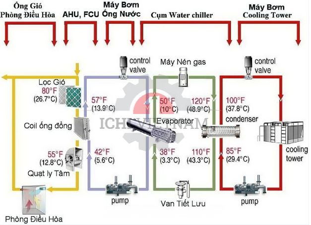 Trong hệ thống Water Chiller, thì Chiller đóng vai trò là trung tâm của cả hệ thống và chia hệ thống ra làm 2 pha rõ rệt: Pha làm lạnh gồm Bình bay hơi của chiller cùng các thiết bị AHU, FCU. Pha giải nhiệt gồm Bình ngưng tụ Chiller và Cooling Tower.