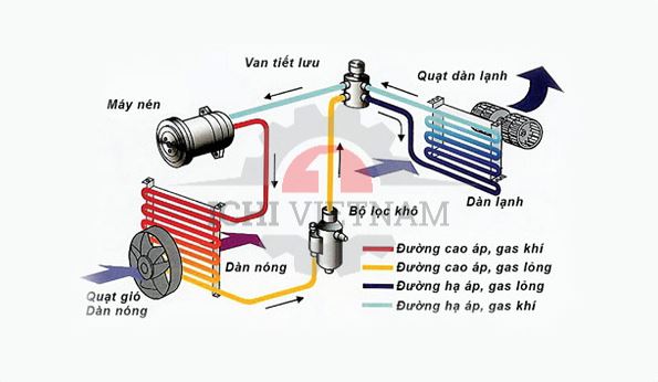 Sau đó, quá trình diễn ra ngược lại: Gas ở trạng thái áp suất thấp sẽ bị nén lại bởi máy nén gas lạnh, lúc này gas đang ở trạng thái hơi áp suất cao. Khi dàn ống đồng thổi gió hoặc từ cooling water đưa gió vào để làm thành gió lạnh thì gas sẽ được giải nhiệt và chuyển sang trạng thái lỏng (hiện tượng thu nhiệt). Tất cả nằm trong 1 chu trình kín. Trạng thái lỏng và hơi của gas được điều chỉnh bằng van tiết lưu.
